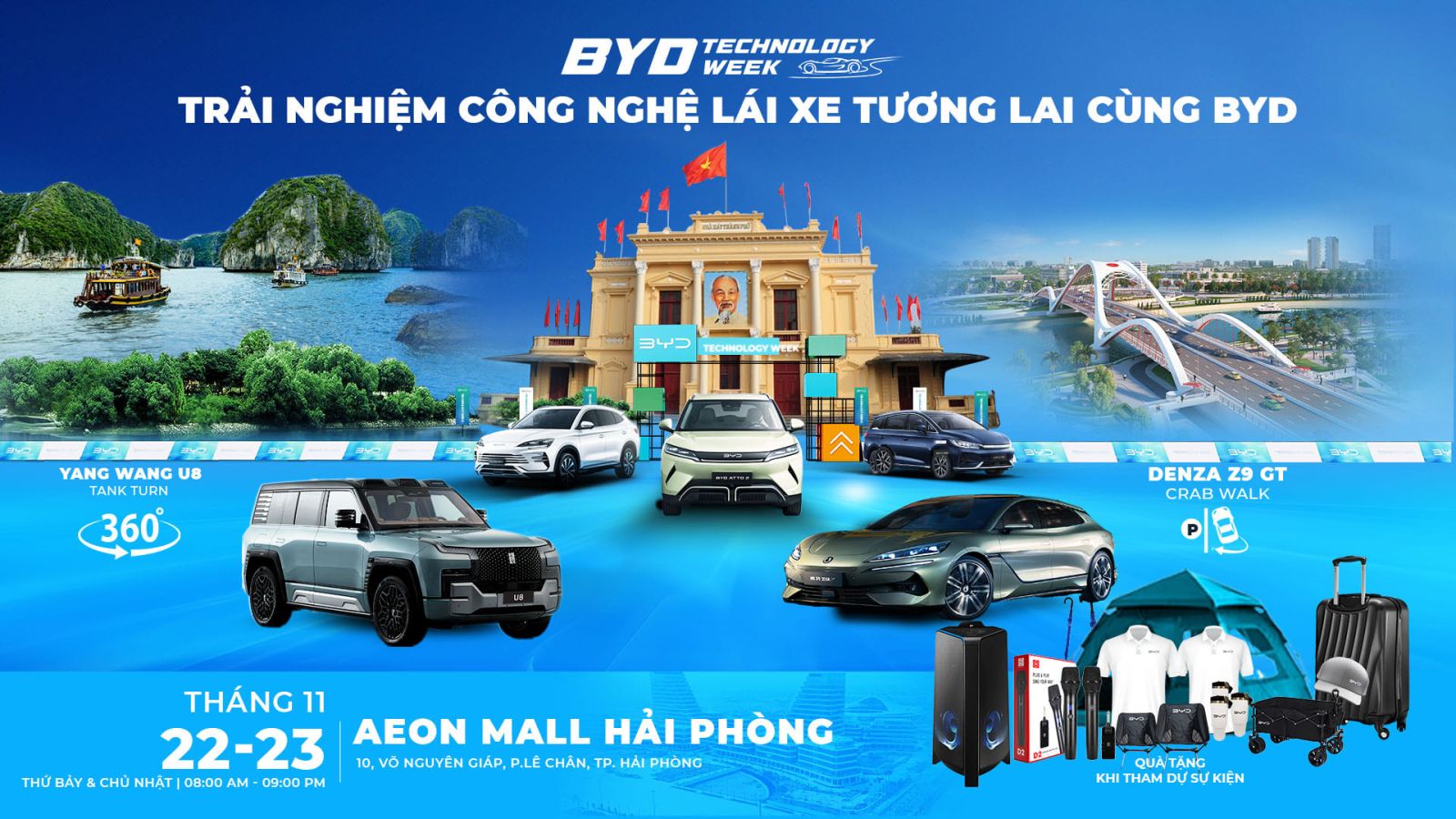 Sự kiện được tổ chức tại khu vực mặt tiền trung tâm thương mại AEON MALL HẢI PHÒNG với thiết kế hiện đại, mô phỏng môi trường vận hành thực tế của các mẫu xe. Đây là lần đầu tiên BYD mang mô hình trưng bày và trình diễn công nghệ xuống Hải Phòng với quy mô lớn, hướng đến các nhóm khách hàng gia đình, người yêu công nghệ và khách tham quan tại trung tâm thương mại.